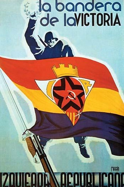 La Bandera de la Victoria. Flag hoisted by a rifle with bayonet. The banner has a central cartouche of a hammer and sickle crowned by a castle tower and a soldier holds up a wreath of the victor1939/Spain
