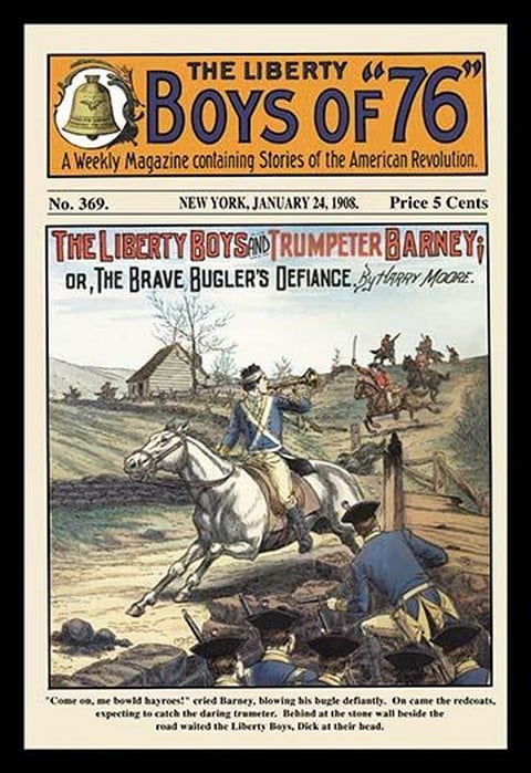 “The Liberty Boys of ’76” was a nickel weekly publication that captivated young readers from 1901 to 1925. Published by Frank Tousey and Harry E. Wolff, this dime novel series transported readers to the American Revolution. Under the pen name “Harry Moore.” Stephen Angus Douglas Cox and Cecil Burleigh likely took turns ghostwriting the stories, keeping the spirit of the Liberty Boys alive for over two decades. The stories revolved around a brave band of American youths known as “The Liberty Boys”. These fictional characters, up to 100 members strong, played their part in the fight for American independence. Led by the unwavering Captain Dick Slater, they faced the dastardly British in every skirmish, defying the odds. The serialized adventures often unfolded between the significant battles of the Revolutionary War, weaving a tapestry of courage, sacrifice, and patriotism. Through these pages, young readers discovered the valor of those who imperiled their lives for the sake of liberty’s cause.