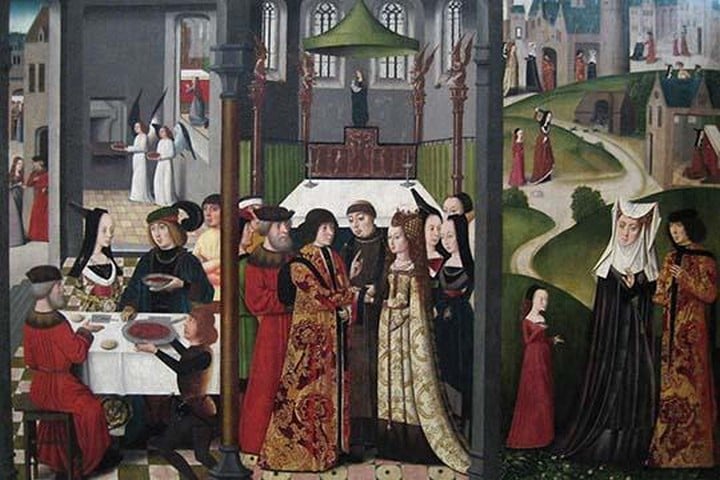 The Life and Miracles of Saint Godelieve Polyptych, last quarter of 15th century.The story of this eleventh-century Netherlandish saint is recounted in seven scenes over five panels (left to right): Godelieve with her family; Godelieve feeding the poor; the feast for the count of Boulogne; Godelieve’s marriage to Bertolf, who plots with his mother against her; and Godelieve’s strangulation and miracles. On the exterior are Saints Josse, Nicholas of Bari, Quirinus, and John the Baptist.This fully intact altarpiece was perhaps commissioned by the Guild of the Load Bearers in Bruges for their chapel in the “Onze-Lieve-Vrouwekerk” (Church of Our Lady). It is attributed to the “Master of the Saint Godelieve Legend” (Netherlandish, active fourth quarter 15th century). When closed, four saintsJosse, Nicholas, Quirinus, and John the Baptistand two kneeling donors are visible. When open for the celebration of Mass, worshipers saw displayed for their edification the life and miracles of Saint Godelieve, patroness of Flanders.Godelieve was born in the late 1040s or early 1050s and died in or around 1070.She is a uniquely the only married female martyr recognized as a saint by a medieval pope. Her life provides a candid account of a disastrous marriage at a time when the joining of individuals and families was central to social, economic, and political organization. Godelieve emerges as a victim of medieval marriage and an example of medieval religious devotion as practiced by a laywoman.1450/Metropolitan Museum, USA