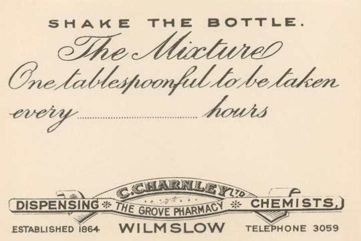 A 1920’s pharmacy bottle label. Many of these were quack cures and the main ingredient often was alcohol.1920/USA