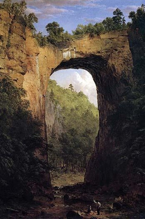 “The Natural Bridge, Virginia” by Frederic Edwin Church is a breathtaking depiction of one of America’s most iconic natural landmarks. Church, a prominent American landscape painter associated with the Hudson River School, was celebrated for his grandiose and meticulously detailed landscapes that conveyed a sense of awe and reverence for the natural world. In this painting, Church captures the majestic beauty of the Natural Bridge, a limestone arch spanning 215 feet across Cedar Creek in Virginia. The scene is bathed in soft, golden light, illuminating the rugged cliffs and verdant foliage that surround the bridge. Church’s skillful use of light and shadow creates a sense of depth and atmosphere, while his precise rendering of the intricate rock formations and cascading waterfalls adds to the painting’s realism. The composition is framed by towering trees, their lush foliage contrasting with the stark grandeur of the bridge. Through “The Natural Bridge, Virginia,” Church not only celebrates the splendor of the American landscape but also invites viewers to contemplate the sublime power and beauty of nature. His work reflects the prevailing 19th-century American belief in the transcendental qualities of the wilderness and the importance of preserving it for future generations. “The Natural Bridge, Virginia” remains a testament to Church’s artistic vision and his enduring legacy as one of America’s preeminent landscape painters, whose works continue to inspire and captivate audiences around the world.