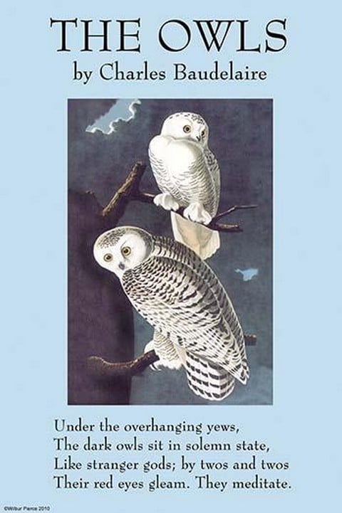 Illustrated by James Audubon’s Owls. Baudelaire is one of the major innovators in French literature. His poetry is influenced by the French romantic poets of the earlier 19th century, although its attention to the formal features of verse connect it more closely to the work of the contemporary ‘Parnassians’. As for theme and tone, in his works we see the rejection of the belief in the supremacy of nature and the fundamental goodness of man as typically espoused by the romantics and expressed by them in rhetorical, effusive and public voice in favor of a new urban sensibility, an awareness of individual moral complexity, an interest in vice (Linked with decadence.) and refined sensual and aesthetical pleasures, and the use of urban subject matter, such as the city, the crude, individual passers-by, all expressed in highly ordered verse, sometimes through a cynical and ironic voice. Formally, the use of sound to create atmosphere, and of ‘symbols’, (images which take on an expanded function within the poem), betray a move towards considering the poem as a self-referential object, an idea further developed by the Symbolists Verlaine and Mallarme, who acknowledge Baudelaire as a pioneer in this regard.1919/France