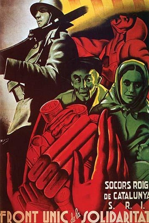 Front Unic de la Solidaritat. Red hands give peasants succor in fabric, vials and other needed products-a solider at shoulder arms passes a destroyed enemy combatant1939/Spain