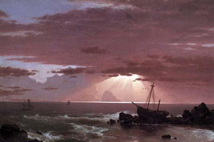 The sun’s rays are like spokes as they break the sky like searchlights over a wrecked ship stranded on a reef, other sailing vessels in the area; Crepuscular rays in atmospheric optics, are rays of sunlight that appear to radiate from a single point in the sky. These rays, which stream through gaps in clouds or between other objects, are columns of sunlit air separated by darker cloud-shadowed regions. The name comes from their frequent occurrences during crepuscular hours (those around dawn and dusk), when the contrasts between light and dark are the most obvious.1860/USA