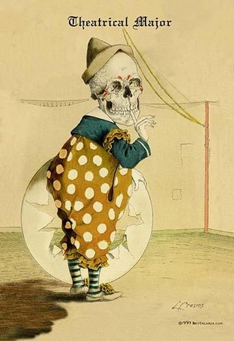 Louis Crusius, MD (1862-1898) was a physician and artist who practiced medicine in the late 19th century in St. Louis, Missouri. Throughout his short life, Crusius created hundreds of humorous medical illustrations that ultimately led to the publication of “The Funny Bone” in 1893. Many were reprinted in the Antikamnia calendars, a series of promotional calendars published by the Antikamnia Chemical Company of St. Louis between 1897 and 1901. The Antikamnia Chemical Company was known for producing a medication called Antikamnia, which was marketed as a pain reliever and fever reducer. These calendars were notable for their unique and visually striking artwork. The illustrations featured whimsical and surreal depictions of skeletons engaging in various activities, often in a humorous or satirical manner. The skeletons were depicted in everyday scenes such as playing sports, dancing, or engaging in leisure activities. Despite their skeletal form, the illustrations were often lighthearted and whimsical in nature.1899/St. Louis