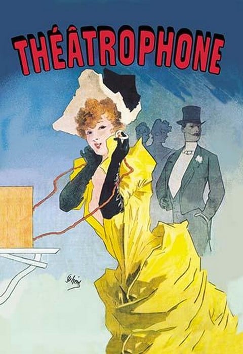 Earliest example of live transmission, for a fee, where the consumer could listen to opera or a recital through the telephone receiver. Known as the father of the modern poster, Jules Cheret (1836-1932) was a French painter and lithographer. He worked on everything from theater to advertising. The theatrophone was a distant ancestor of the jukebox. An early telephonic device, it was originally used to ‘broadcast’ music from the Paris Opera. Anyone who inserted a coin could listen to the music through earphones. Although the beautiful subject is a picture-perfect Cherette, she is uncharacteristically wearing black gloves, which Cheret probably provided so that he could more precisely render the use of the actual machine. The gentleman in the background is suggestively waiting, either for the woman or to use the phone.1890/France