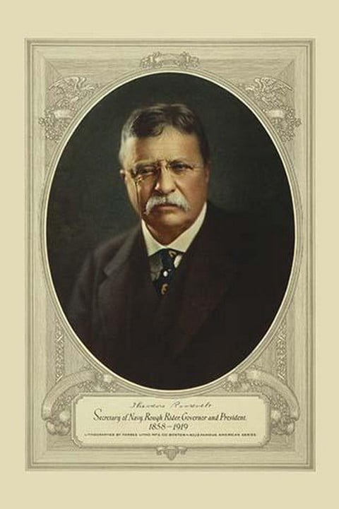 Print showing Theodore Roosevelt, head-and-shoulders, facing front, in oval. ‘Theodore Roosevelt, Secretary of Navy, Rough Rider, governor and president, 1858-1919.’1920/USA