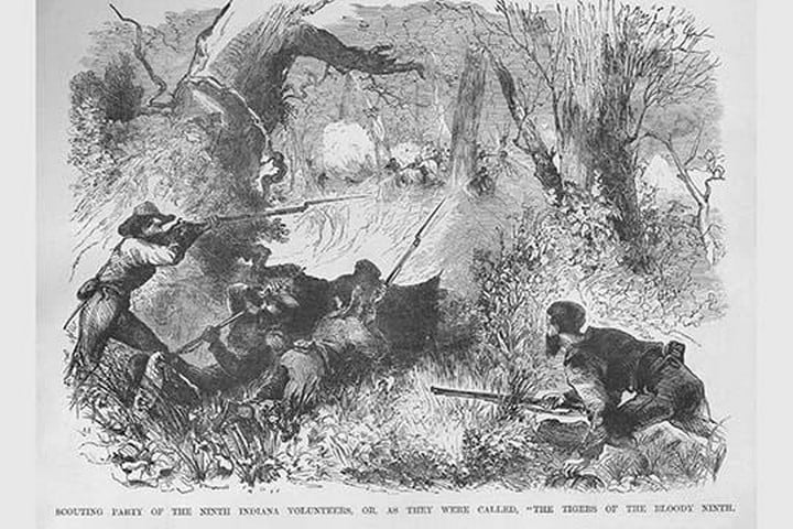 Frank Leslie was a prominent 19th-century American illustrator, publisher, and editor. He started as an illustrator for popular periodicals and established his own publishing company, “Frank Leslie’s Illustrated Newspaper,” which became one of the most successful and influential newspapers of its time. Leslie was also a pioneer in the use of photographs in journalism and established a photographic studio to create original images for his newspaper. He wrote several books and plays and was an important figure in the development of American media, shaping the way news was reported and disseminated. He died in 1880, leaving a lasting legacy.Tigers of the Bloody Ninth’-Indiana Volunteers Scouting Party1861/USA