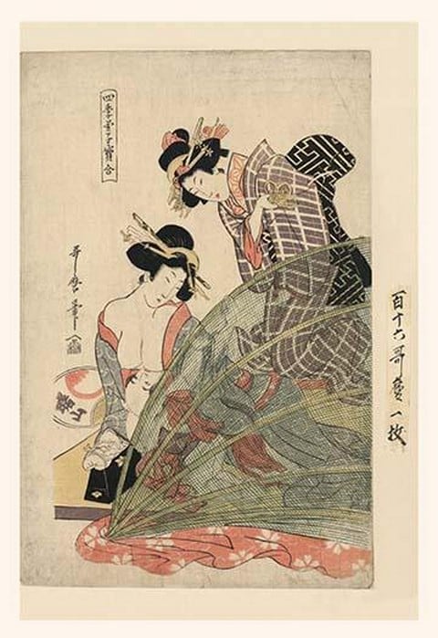 Two people play instruments as one folds clothes. This noble gathering takes time to just relax.1850/Japan