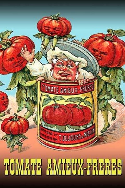 Modern version of advertising from the 1900’s for a canned tomato. In 1900, the house Amieux Brothers began diversifying its activity jams, chocolates, mustards, pickles, and pies. As part of their major campaign to attract customers the used some the greatest poster designers of the Belle Epoque. Here is an example where tomatoes are trying to stuff a chef into a can.1900/France