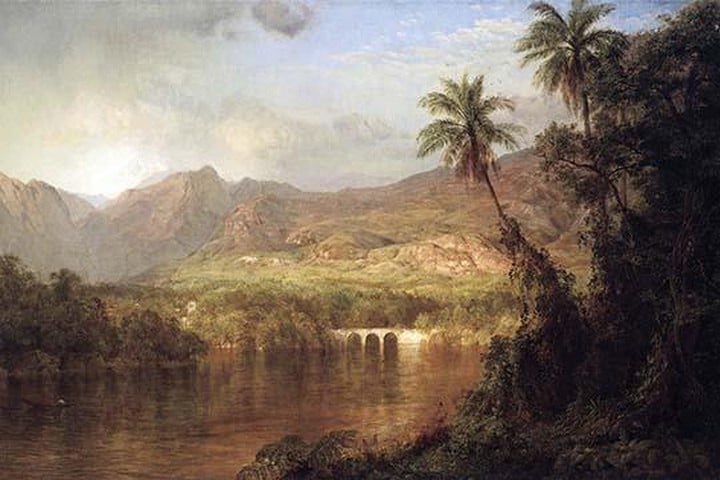 Tropical scene with arched bridge and monastery in background nestled into the jungle1860/USA