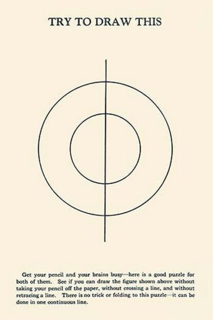 Harry Houdini (1874-1926) was a magician and American stuntman, famous for his sensational escape acts. As a child he and his brother Theo began to pursue an interest in magic. As a stage name, Ehrich Weiss became Harry Houdini by slightly changing the name of his idol, French magician Robert Houdin. At 17, the young man, now known as Harry Houdini, left his family to pursue his career in magic. He first drew attention to his talents in vaudeville in the United States and then as a “Harry Handcuff Houdini” during a tour of Europe, where he defeated police forces from keep him locked up. He soon added to his repertoire, including chains, ropes suspended from skyscrapers, straitjackets, and having to escape and hold his breath inside a sealed box containing water.The poster of “Try to Draw This” is an illustration from “Houdini’s Book of Magic and Party Pastimes: Fascinating Puzzles, Tricks and Mysterious Stunts, Selected by Houdini, The World’s Greatest Magician.” The book was published posthumously by Stoll & Edwards, 1927, copyright by Beatrice Houdini, Executrix of the Estate of Harry Houdini. Other drawing puzzles included in the book are “Can You Draw This?” and second puzzle also titled “Can You Draw This?”1927/USA