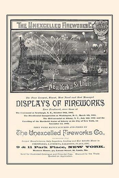 Advertising insert page for a firework manufacturer in a catalog showing fireworks over New York Harbor and the Statue of Liberty.1887/USA