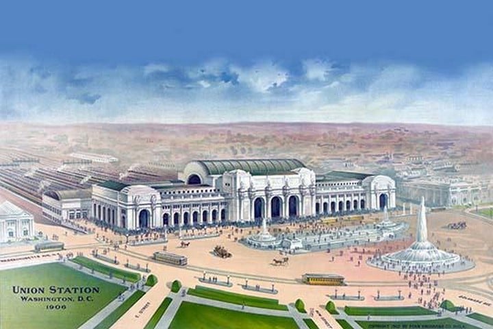 Print showing bird’s-eye view of Union Station with fountains in the foreground.Unknown Date/USA