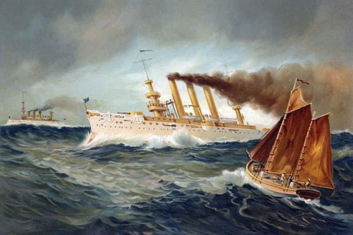 The New York (left, in distance) and the Brooklyn (center), at sea, significant ships in the culmination of the Spanish-American War, and fishing boat (right, foreground). All part of Navy’s North Atlantic Squadron.1898/USA
