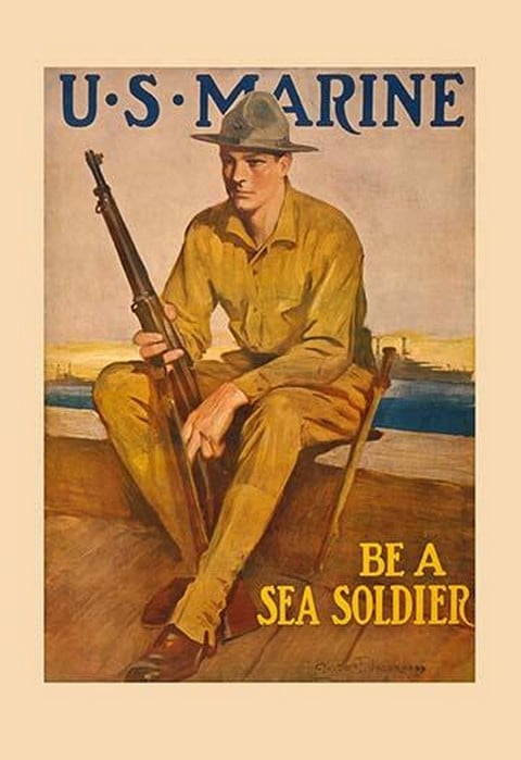 A U.S. Marine takes a minute to relax sitting atop a harbor wall. One of Underwood’s posters supporting to war effort in WWI.1917/USA