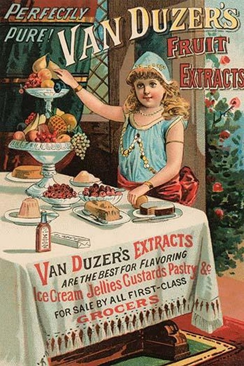 A Victorian trade card advertising perfectly pure Van Duzer’s fruit extract. A flavoring for ice cream jellies custards and pastries. Sold by grocers.Unknown Date/USA