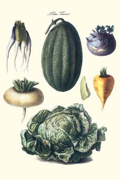 Vegetables; melon, turnip, lettuce, cabbage, Illustration from a famous French seed catalog and the vegetables that can be grown.1775/France