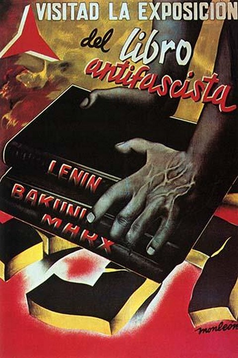 Books by Lenin, Marx and Bakunin advertise the exhibit. Visitad la Exposicion del Libro Antifascista1937/Spain