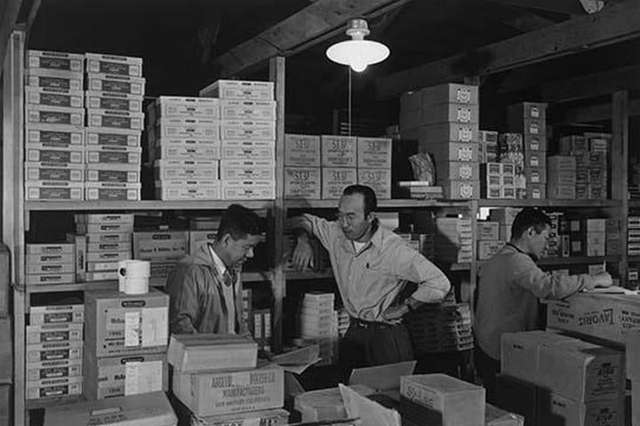 M. Ogi, S. Sugimoto, and Bunkichi Hayashi standing among shelves with boxes in warehouse. Ansel Easton Adams (1902-1984) was an American photographer, best known for his black-and-white photographs of the American West. During part of his career, he was hired by the US Government to record life in the West.1943/USA