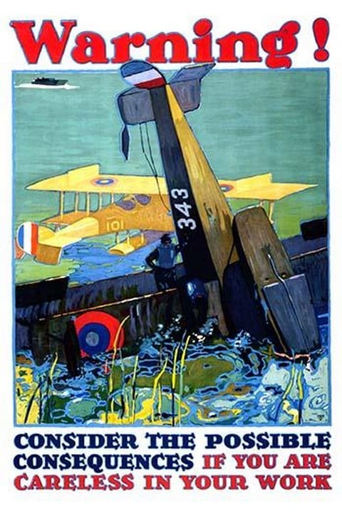 Warning! Consider the possible consequences if you are careless in your work; an airplane crashed in the ocean, with survivors and a rescue plane.1917/USA