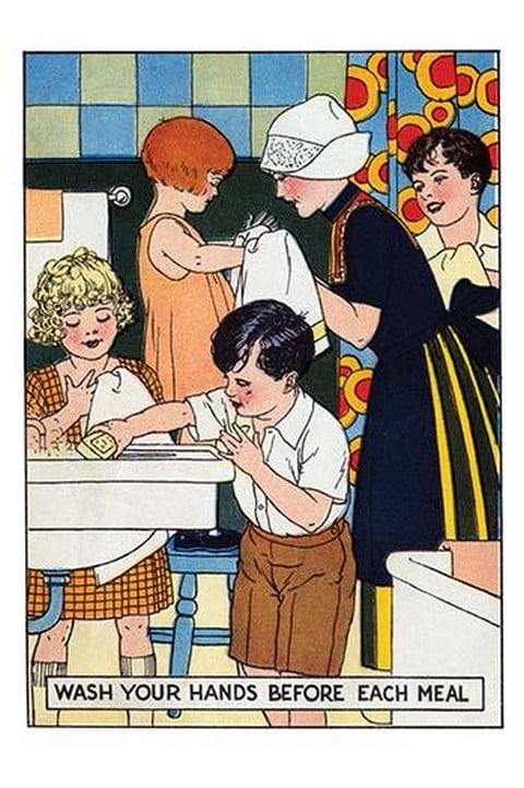 A group of children wash their hands at the sink assisted by a Dutch girl.1926/USA