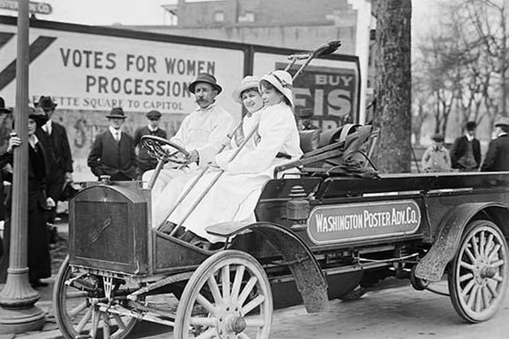 Washington poster Advertising Company Truck Carries Suffragettes armed with broom handled brushes armed to post advertising for their forthcoming march to Lafayette Square1914/USA
