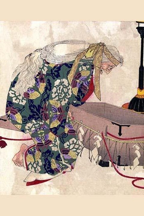 Ukiyo-e print illustration showing the demon Ibaraki posing as Watanabe no Tsuna’s Aunt Mashiba, having tricked Tsuna, Ibaraki is shown here peering into the box where Tsuna stored its severed arm. Watanabe no tsuna to ibaraki1882/Japan