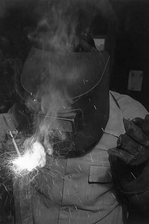 Welder in machine shop, half-length portrait, standing, facing front, welding, wearing protective gear. Ansel Easton Adams (1902-1984) was an American photographer, best known for his black-and-white photographs of the American West. During part of his career, he was hired by the US Government to record life in the West.1943/USA