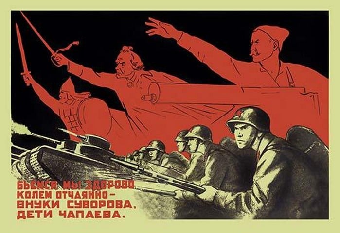 Red Infantry moves forward in foreground while images of their forbear soldiers appear red in the sky leading them on1940/USSR