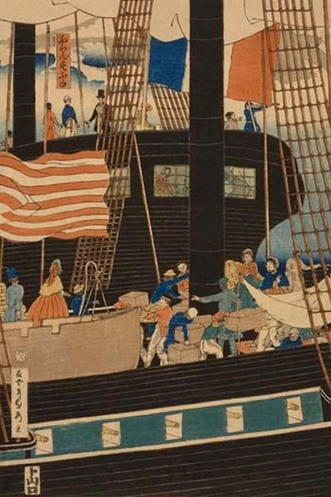 Japanese pentaptych print shows an American ship in the harbor at Yokohama, Japan; small boats ferry cargo which is being carried up a gangplank contributing to the bustle of activity on the main deck. Done by Utagawa Sadahide (1807-1873) in 1861.1861/Japan