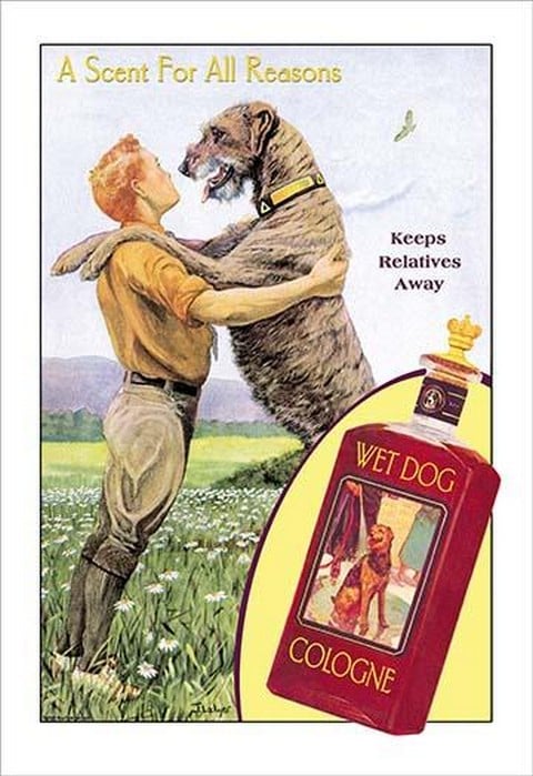 A large Irish wolfhound rests his paws on a young boys shoulders and advertises a bottle of wet dog cologne.2000/USA