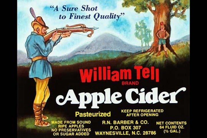 Original bottle label for William Tell brand apple cider showing the famous tale of shooting the apple off a boy’s head.Unknown Date/USA
