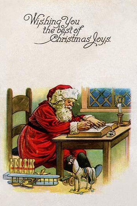 Old St. Nick sits at his desk writing a list of good girls and boys by candle light. He is surrounded by toys awaiting new homes. This is from a vintage postcard bearing Christmas wishes.Unknown Date/USA