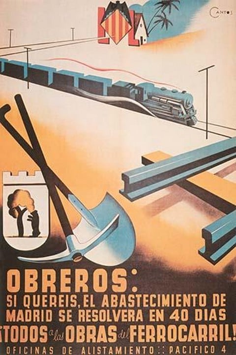 Todos a Las Obras del Ferrocarril!. Trains, Railroad, rails, shovel and a pick with a bear in the crest of Madrid shows the rescue of the city with supplies1939/Spain