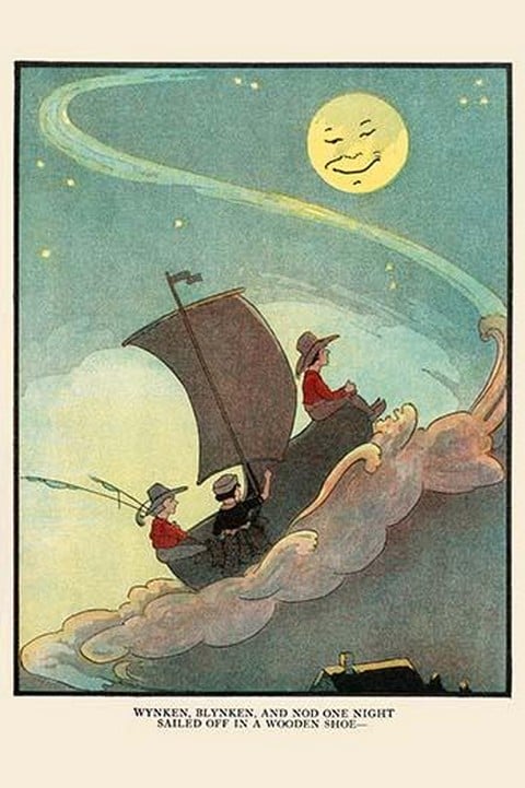 Wynken, Blynken, and Nod is a popular children’s poem written by American writer and poet Eugene Field and published on March 9, 1889. The original title was “Dutch Lullaby”. The poem is a fantasy bed-time story about three children sailing and fishing among the stars, in a boat which is a wooden shoe. The names suggest a sleepy child’s blinking eyes and nodding head.1925/USA