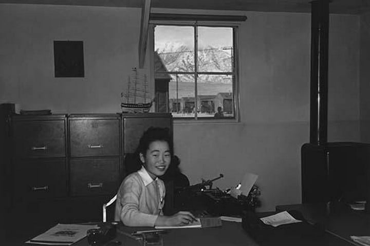 Yoshiko Joan Mori, half-length portrait, seated at a desk in an office, facing slightly right, holding a pen in her right hand over a steno pad. Ansel Easton Adams (1902-1984) was an American photographer, best known for his black-and-white photographs of the American West. During part of his career, he was hired by the US Government to record life in the West.1943/USA