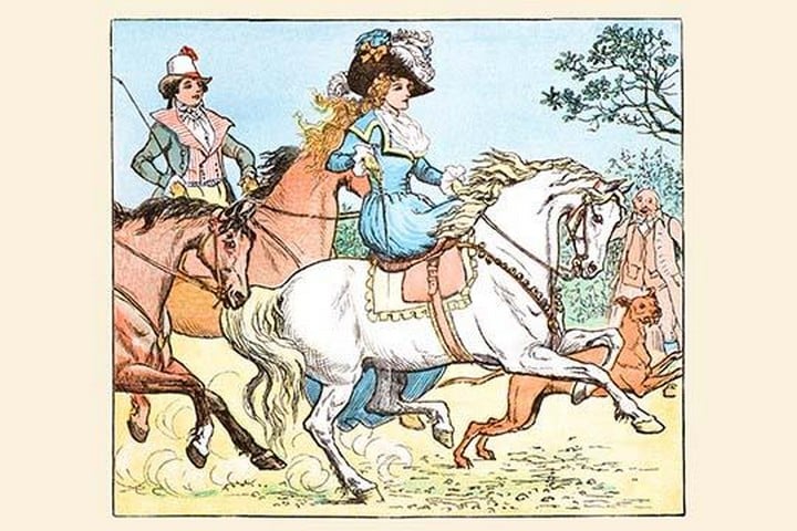 Young Girl Rides a White horse followed by a suitor1878/London & New York