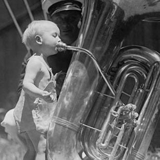 An nearly naked infant toots a tuba many times his size